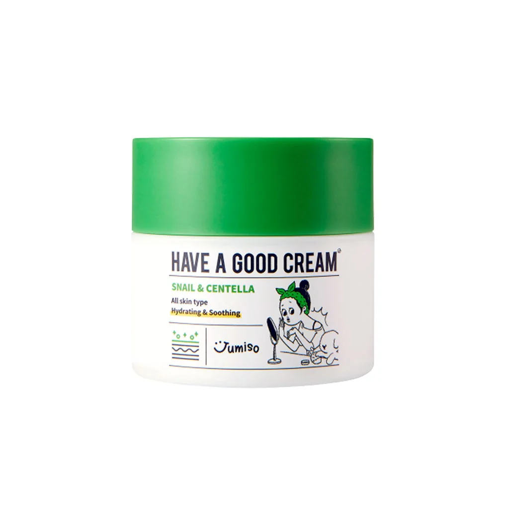 Jumiso Have a Good Cream a daily moisturizer formulated with snail secretion filtrate and centella asiatica extract to soothe and hydrate skin, replenishing its natural moisture barrier, improving skin texture and elasticity.